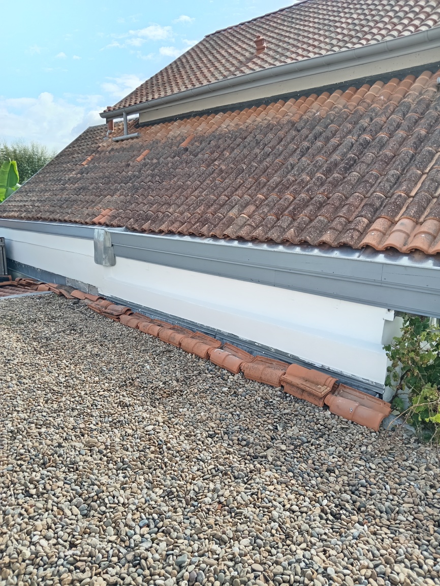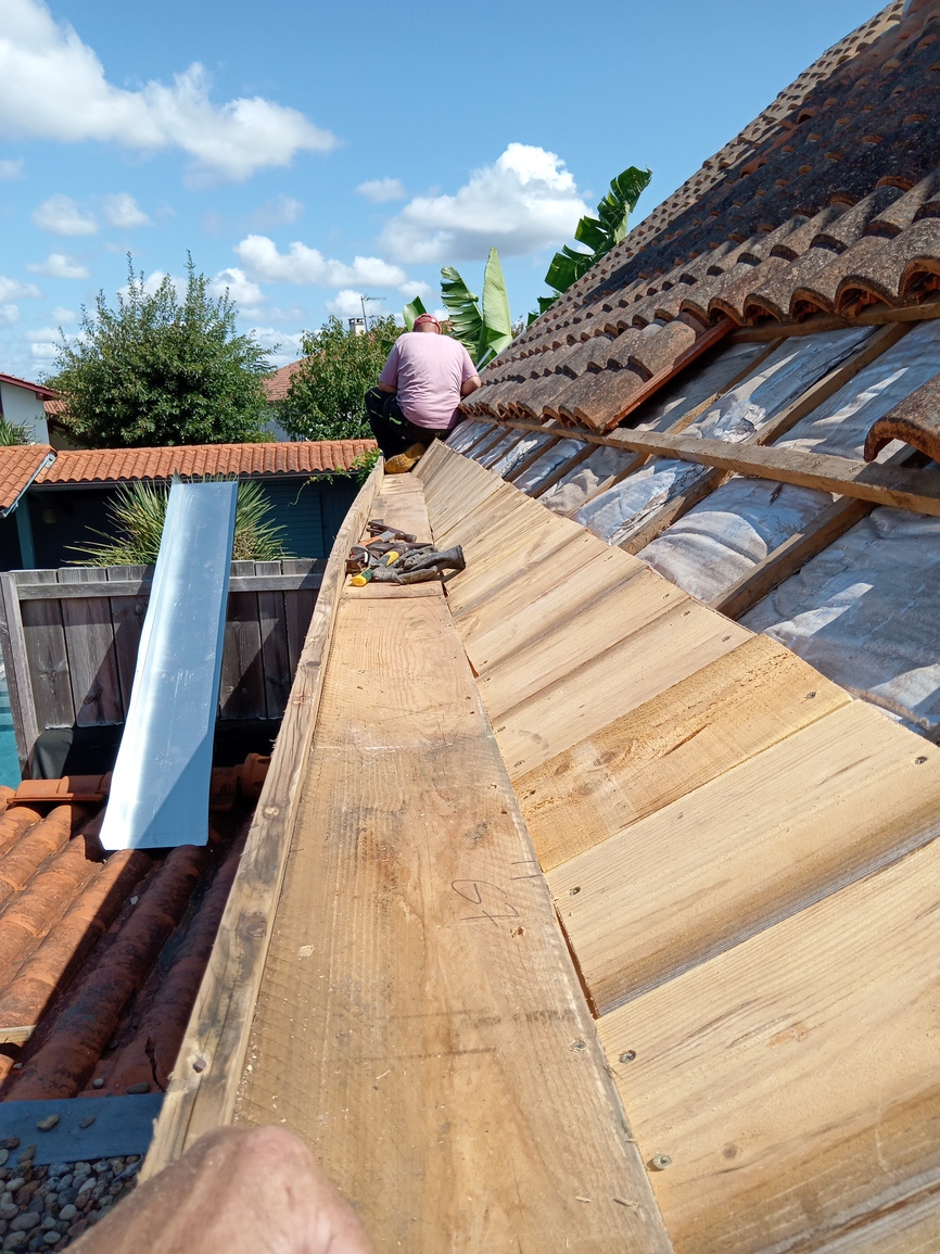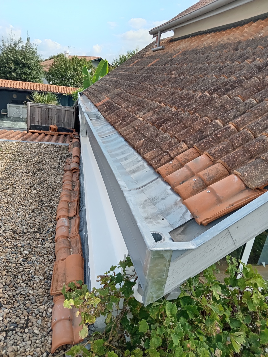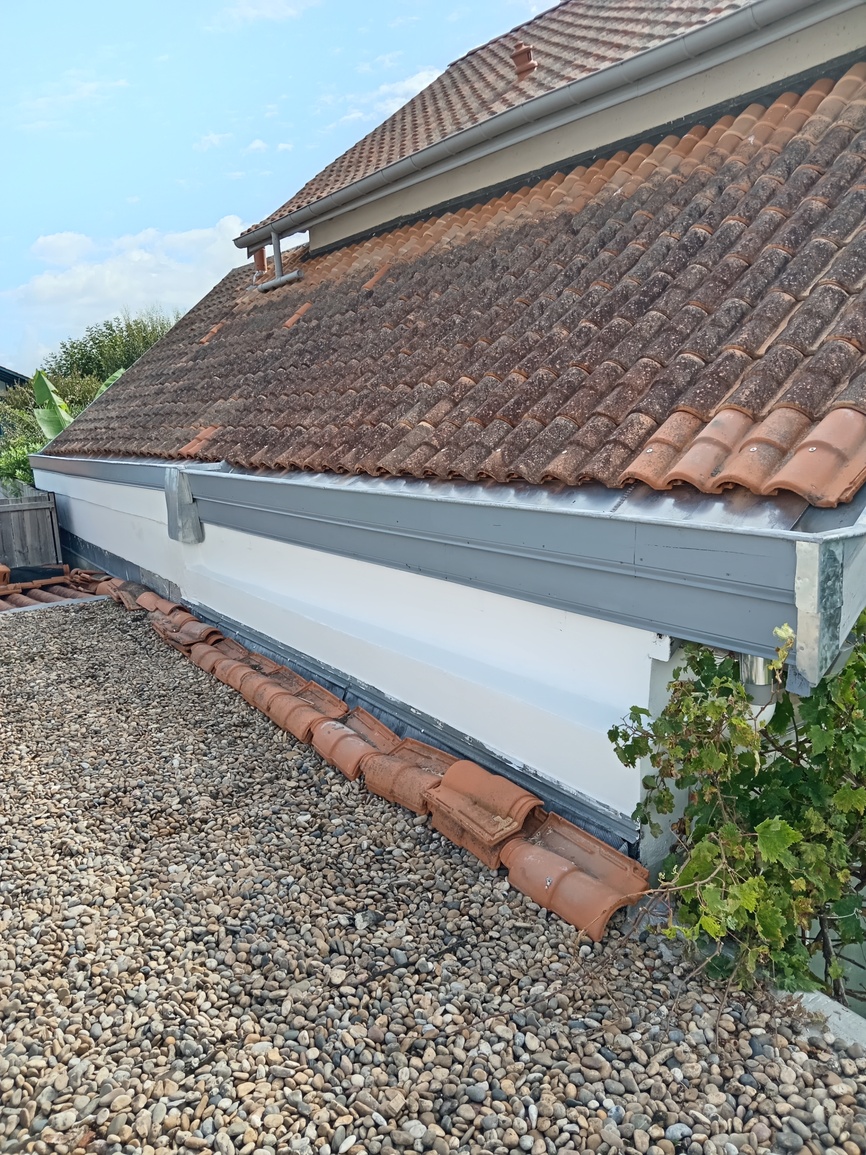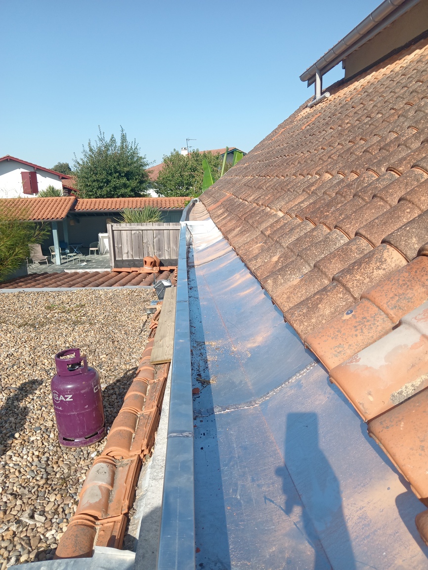 Dépose de l’ancien chenau en zinc, recalage et pose de volige, puis installation d’un nouveau chenau en zinc